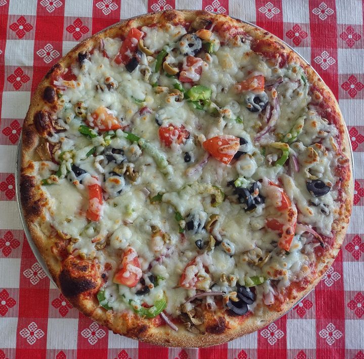 Veggie: Scratch-made Marinara, Mushroom, Roma Tomato, Green Olive, Black Olive, Red Onion, Bell Pepper, Whole-milk Mozzarella