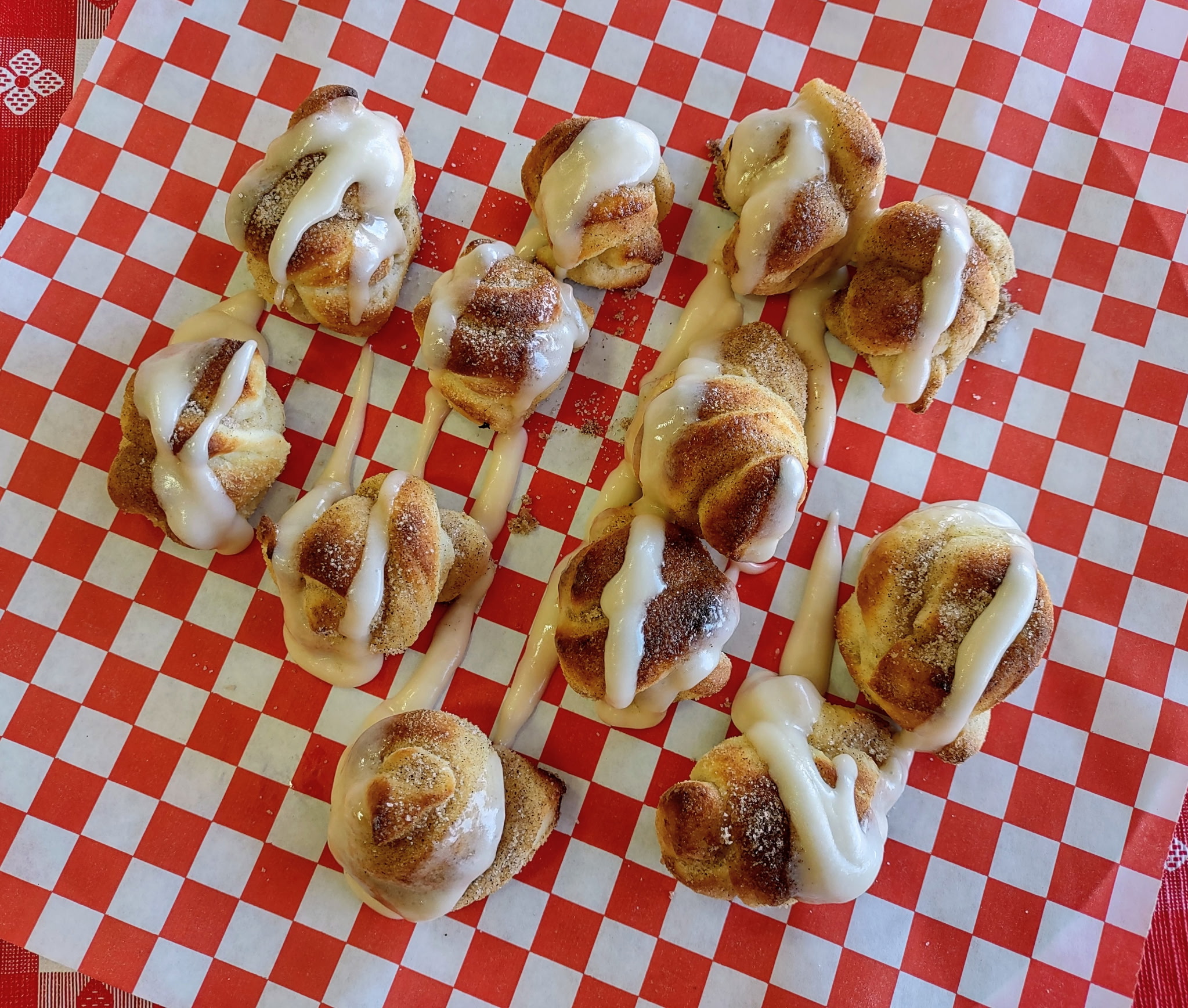 Our scratch-made dough knotted up, baked, topped with cinnamon sugar and homemade icing. 12-14 per order